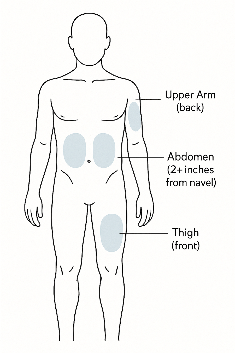It is important to rotate your injection sites to avoid irritation and ensure proper absorption. The most common sites for subcutaneous injections are the abdomen, thighs, and the back of the upper arms.
